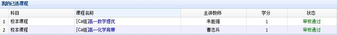 l对于竞赛类课(即C类,不能自选的课),学生不能自己选课,由老师提交名至网站。竞赛也算一门选修课程,若有两门竞赛课程则无需再选择选修课,只有一门竞赛课程的同学需再选择一门与竞赛课程不相冲突的选修课程。