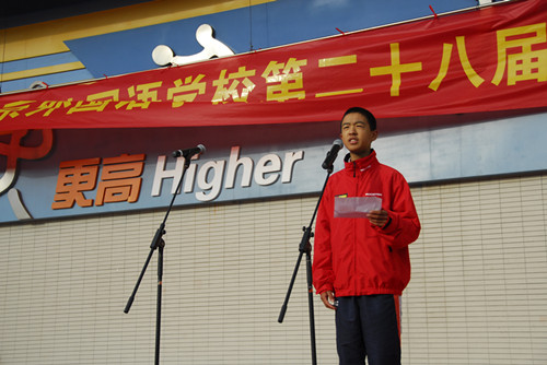 马:拥抱青春,追逐梦想,这是我们这届体育节的主题。在体育节,我们将一同分享训练的汗水和成功的喜悦,收获我们自己的故事。下面,有请周校长为我们致第28届体育节开幕词,掌声欢迎。