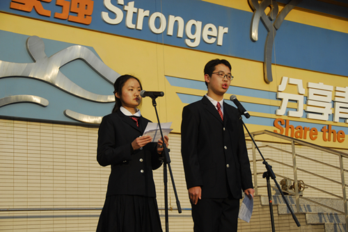 李:尊重,在我们的人际交往中是必不可少的。对意气相投的朋友真诚以待,对认识的老师道声早安,都是尊重他人的体现。然而,在我们的社会中,还有这样一群人正更加迫切地期待着人们的理解和尊重。他们生而不幸,因为身体上的残疾,而被限制在社会的边缘,很少被人们所了解。今天,我们就希望利用这次晨会,带大家领略残障人士的生活,在关注和理解的基础上,建立起对他们更深层次的尊重。