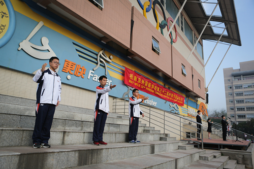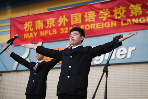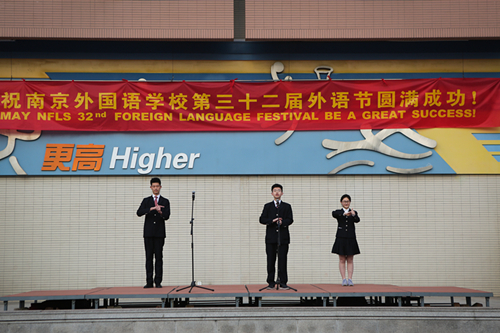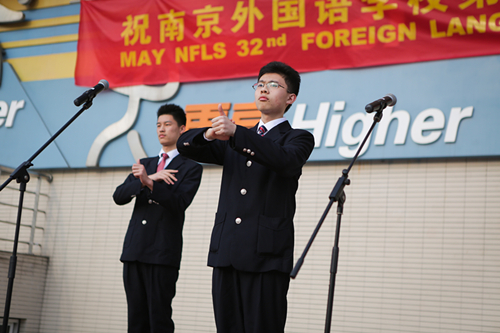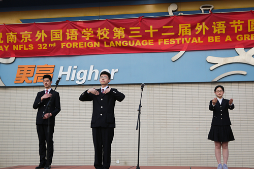 X: 接下来,就让我们有请高二学生代表为我们带来手语歌曲《我爱你中国》。