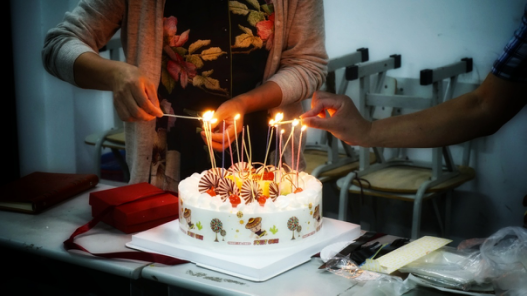既然是集体生日,没有蛋糕怎么行呢?学校为这次活动也是煞费苦心,准备了蛋糕和许愿瓶。点点星星的蜡烛光闪烁了起来,直到18簇火焰一齐发出温暖的红光。灯忽地熄灭了,大家一同唱起生日歌,望着三位主角在烛光中吹灭了蜡烛。短暂的黑暗后灯复亮起来,紧接着就是吃蛋糕了,本次活动也接近尾声。这时人数不多的优势就体现出来了,每个老师和同学都分到了满满一碟蛋糕。