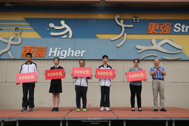 “书山有路勤为径,学海无涯苦作舟”。在过去的一学年中,优秀的南外学子用自己的努力和付出取得了骄人的成绩。今天我们在这里举行南外基金会2017-2018学年优秀学生奖颁奖仪式,有请获得中考南京市前10名的4位同学上台领奖,他们是高一1班 陈骊文、李忻然、何逸菲,高一2班李泽权。 有请邹正校长为他们颁奖。
