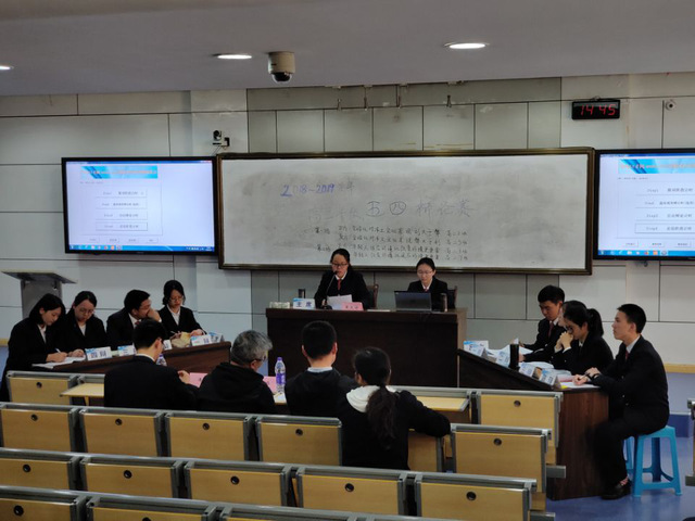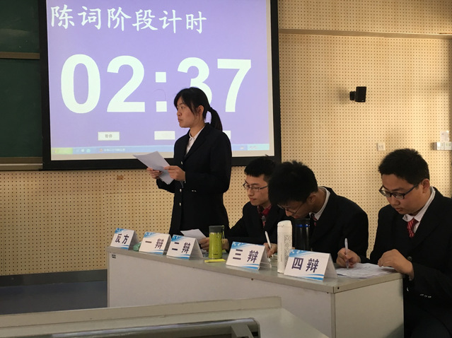 二楼阶梯教室由侯允迪同学作为主席,评委是余一鸣老师,王少林老师,潘浩和朱静宜同学,计时员是罗依凡同学。