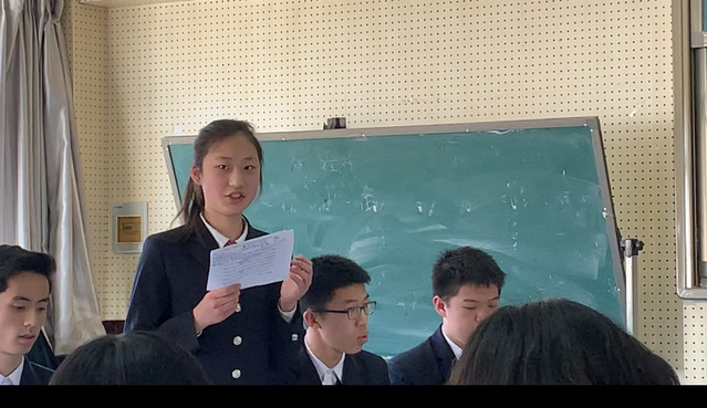 第二场进行的是高二(3)班必胜队高二(7)班阿列克谢队的比赛,题目为年轻人适应环境和改变环境哪个更重要”。双方在达成适应环境是改变环境的基础的共识上,就结果和过程哪个更重要进行讨论,特别是双方的四辩,你来我往,逻辑清晰,碰撞出思想的火花。