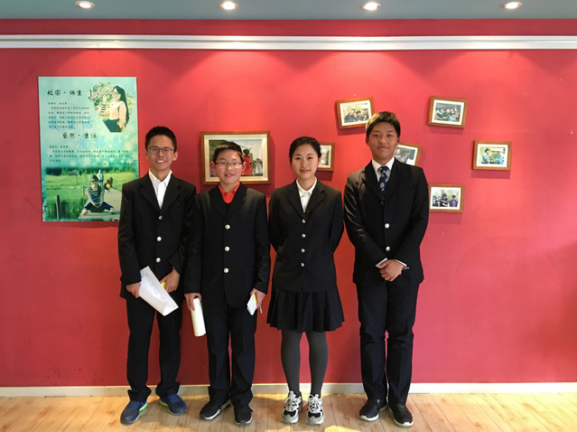 三楼阶梯教室赛场,由高三的陆静文同学担任主席,韦婕、蒋薇、刘伟老师和龚昕冉、徐菁夷同学担任评委,桂野同学担任计时员。