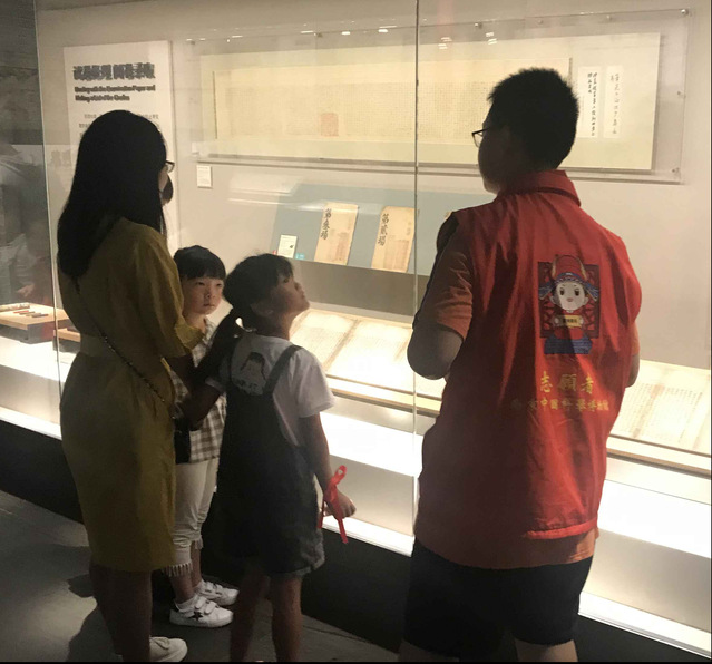 同学们很快进入了角色,热情地引导来访者、回答他们提出的各种问题。中国科举博物馆有一件镇馆之宝,那就是状元馆内珍藏的“赵文楷第一甲第一名殿试卷真迹”,长约260公分,高45公分,共22折,1942字,很多外地游客慕名前来参观。这其中有不少小学生朋友,他们会拉着自己的父母问东问西,常常问得父母们不知如何作答,这时我们南外同学平时的广泛阅读积累可就帮上了忙,你看他们落落大方侃侃而谈,耐心细致地回答小朋友们的问题,父母们离开展厅时都会叮嘱一句“你看,大哥哥大姐姐们都读了很多的书,你以后也要多多读书。”而我们自己也在帮助他人的同时获得了自信和力量。