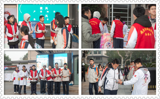 12月2日周一的清晨,来自学生社团小丑医生社、急救健康社的十几名同学一早就来到学校门口,连同学校医务室的校医们,为进入校园的同学和老师们发放防艾宣传手册,同时鼓励师生们在校门口的签到墙上留下姓名,以表示全校师生对知艾防艾活动的支持。