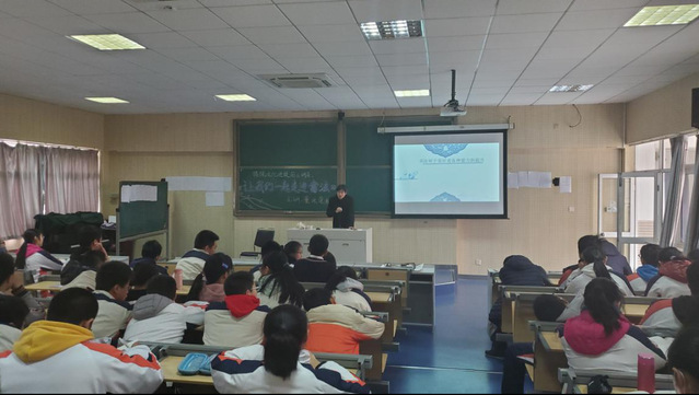 2019年12月19日下午12:30,校三楼阶梯教室座无虚席,来自高二、初二的年级近200名师生,听取了一堂有深度有广度的书法讲座,主讲人是江苏省文化研究院的董水荣教授。首先董老师给大家介绍了写书法的几大益处:可以修身养性,锻炼意志和体格;可以培养良好的审美观和人生观;然后董老师通过鲜明的事例,教授大家如何辨别书法和书写,让大家更好的体会书法艺术的精妙;最后,还给大家列举了几位书法大家的书法特色和人生成就。短短的一节课时间,让同学们开阔了眼界,明白了书法与生活、书法与做人的关联,同时加深对博大精深的书法艺术的认知。