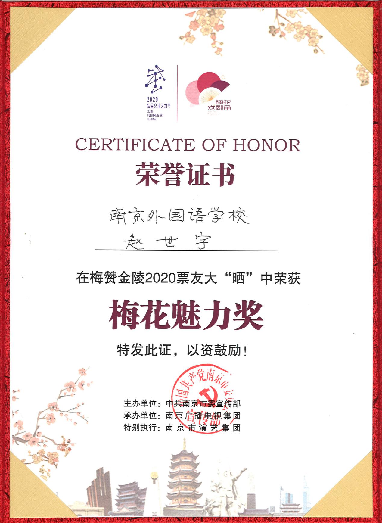 大“晒”设置“梅花魅力奖”、“梅花活力奖”、“梅花传承奖”等三大奖项。为了完美亮相这次戏曲“嘉年华” ,赵世宇同学在南外星艺俱乐部指导老师、南京青年越剧团团长陶丽艳老师的精心指导下,刻苦排练了他的拿手好戏越剧——《沙漠王子》选段。在经过海选、初选、决赛等一系列大“晒”活动后,赵世宇以其精彩的表演从400多位参赛选手中脱颖而出,成功摘得“梅花魅力奖”。大“晒”评委之一、省剧协副主席、国家一级演员、第十六届中国戏剧“梅花奖”得主陶琪老师对赵世宇的表演给予了高度的评价:“扮相俊美,沉稳大气,字正腔圆……”。