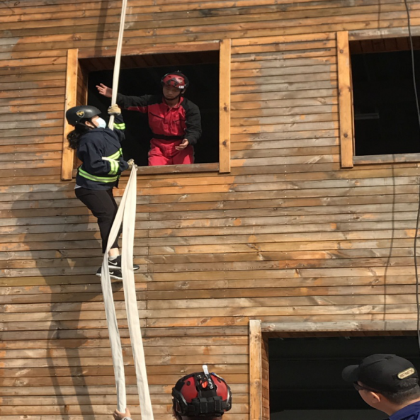 当天下午,我们就迎来了最“刺激”的项目——高层逃生课程。望着三层木质小楼,很多老师都流露出的畏惧情绪。教官当即问及有无老师有恐高,很多老师都举起了手,教官接着追问:“这是医院诊断结果吗?”,“你的症状是怎样的?”。一番对话下来,教官微笑着说:“大家表达的都是害怕,而不是恐高。今天的训练就是帮大家克服害怕的极好机会。”随后在教官的耐心讲解和热情鼓励下,三位男老师率先完成了消防水带下降,女老师们也陆续跟上。taptap李炜老师一马当先,戴上防护手套,走上二楼,极为标准地完成了消防水带下降。此后的绳索下降和软梯下降,大家都更为顺利地完成了。与此同时,教官还教授了我们一些基础绳结,如八字结、蛇口结、防脱节。