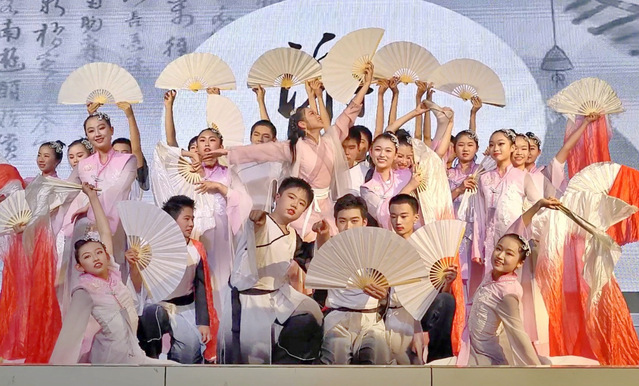 最后,如何在舞台上呈现这一切?我们设计编排了一个含有上述元素的舞蹈!我们请来舞蹈老师,克服各种困难开始了一遍遍练习...... 一承,闺中女儿织锦绣,雍容雅致。二承,陌上书生开纸扇,诗书养心。三承,长袖娇娥,纸扇书生,鼓起激扬,舞惹豪情。在纸扇扬起的一刻,高韬进取、挥斥方遒,这一刻满载家国、情怀激荡!终于,在年级文艺汇演现场进行了完美的展示!