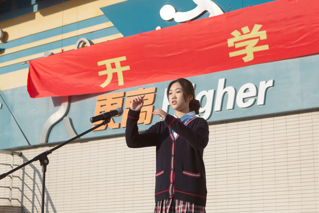 最后让我们大声齐唱校歌《世界情怀》,有请初二4班吴玥同学担任指挥。