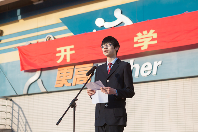 做梦想家、做毅行客、做善思者。熊薇老师启发我们在新学期要选择勤勉和奋斗,纪律与约束,拼搏与超越。下面我们有请高三学生代表来自高三(2)班的俞骏文同学为我们分享他的新学期展望,大家欢迎。