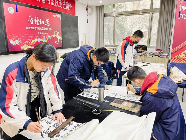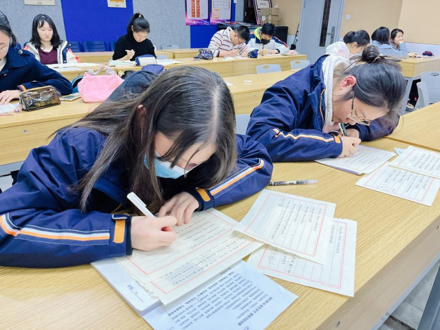 2021年12月22日16:10——17:30,taptap“赓续红途”现场书法大赛于艺术中心201、202、205教室进行。本次比赛分为硬笔、软笔两个类别,软笔书法参赛者可自选以“奋斗百年路 启航新征程”主题的古诗文,硬笔书法参赛者统一现场命题。来自初中部、普高和国际部的80余位同学参加了比赛,以书法的形式致敬传承千年的民族文化。
